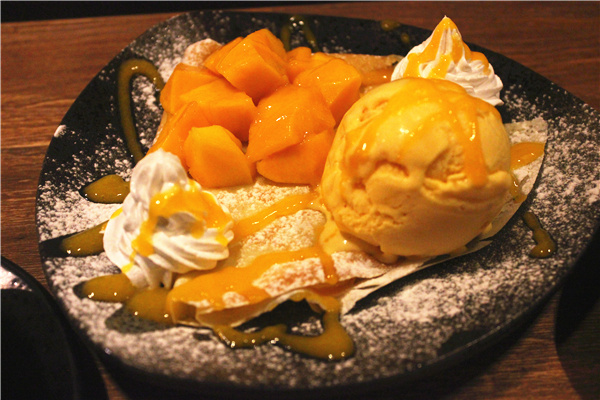 才华满腹的“吃货”老板当然不满足于这一道招牌甜点,他亲自开发并制作了几道特色甜点。芒果奶酪冻是一款由西班牙甜点改良后的新品,布丁由鲜奶现做,浓醇的奶味配以芒果的香甜,成就了一场舌尖上的盛宴。而沿袭自法国甜点的芒果可丽饼可谓是色香味俱全,现做可丽饼的酥软有嚼劲,覆满冰淇淋,奶油,芒果酱以及新鲜芒果,在口腔中激烈地碰撞出华丽的火花。有时候,生活只需要一道合乎心意的甜点,便能获得满足感。
