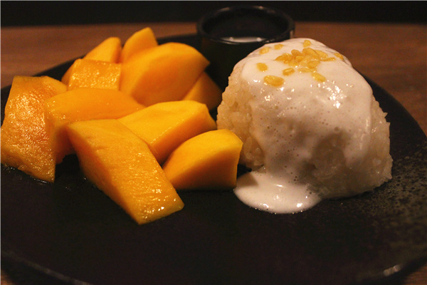 作为第一家以芒果糯米饭为主打的甜品店,这道看似简单的招牌甜点其实也是大有讲究的。秉承着以新鲜水果为原料和健康原生态的理念,小店里各色甜品的原料尽量选用当季最好的食材。夏日采用了素有“热带果王”之称的台湾水仙芒,橙黄的果肉配以水仙芒独特的花果香,醇香多汁,鲜美可口。即使是不产芒果的冬天也尽量采购品质高的广西、四川芒果。另外一大主材糯米也是选用泰国进口糯米,视觉上每一颗每一粒都细长而饱满,蒸制时会有浓浓的米香味,不由得勾起我们的食欲,而与经过调味后的纯椰汁充分融合,口感黏稠鲜香,只需一口就知道这会是念念不忘的味道。