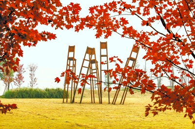 生态艺术公园里,湖水坡岸、枫叶景致,如诗如画