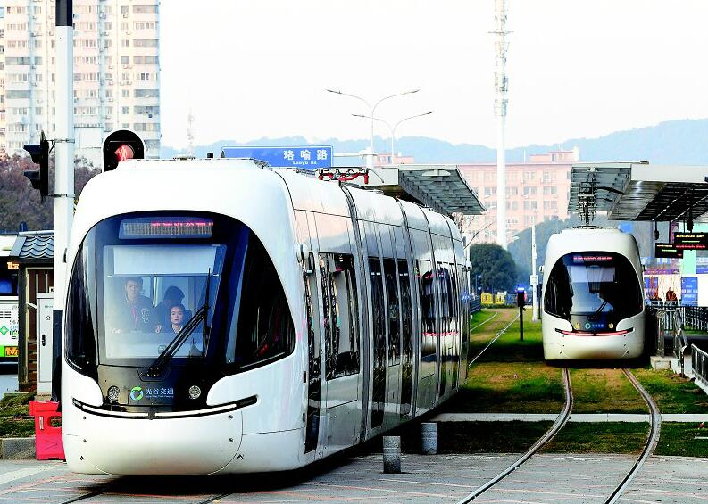 湖北日报讯(全媒记者张朋 通讯员黄策 摄)12月18日,“光谷量子号”列车在武汉关山大道上行驶。当天,武汉光谷现代有轨电车 T1、T2示范线进行首次全线试运行,计划下月中旬通车试运营。