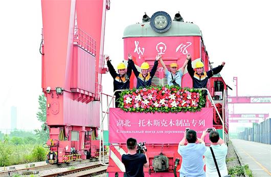 湖北日报讯 图为:由俄罗斯托木斯克州开往武汉的木制品专列顺利抵汉。(湖北日报全媒记者 倪娜通讯员 王遥遥 摄)